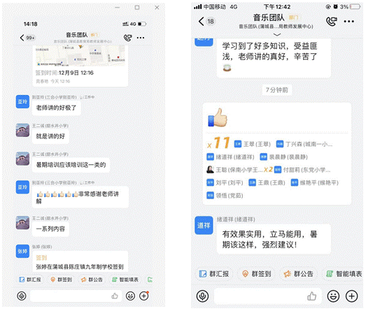 课程结束后参训老师们纷纷点赞,在课程群中表示课程“特别实用”,“老师讲的好极了”,“学习到了好多知识,收益匪浅,老师讲的真好,辛苦了”等内容感谢艺术系老师的讲解,并表示期待后续更多的课程,并建议暑期能安排类似培训。