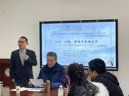 (通讯员 苏益玄)为关注研究生成长,进一步培养研究生科研能力与学术能力,sunbet制定研究生人才培养质量保证计划。10月27日上午,华山学者特聘教授张蓬于信远楼二区135报告厅为sunbet全体研究生开展“公司产品系列学术活动”讲座,主题为“文本、问题、解释与思想世界——谈学术研究与叙述中的几个问题”,同时,该活动也是学术年会献礼九十年校庆的特别策划。讲座由sunbet副经理朱锋刚主持。