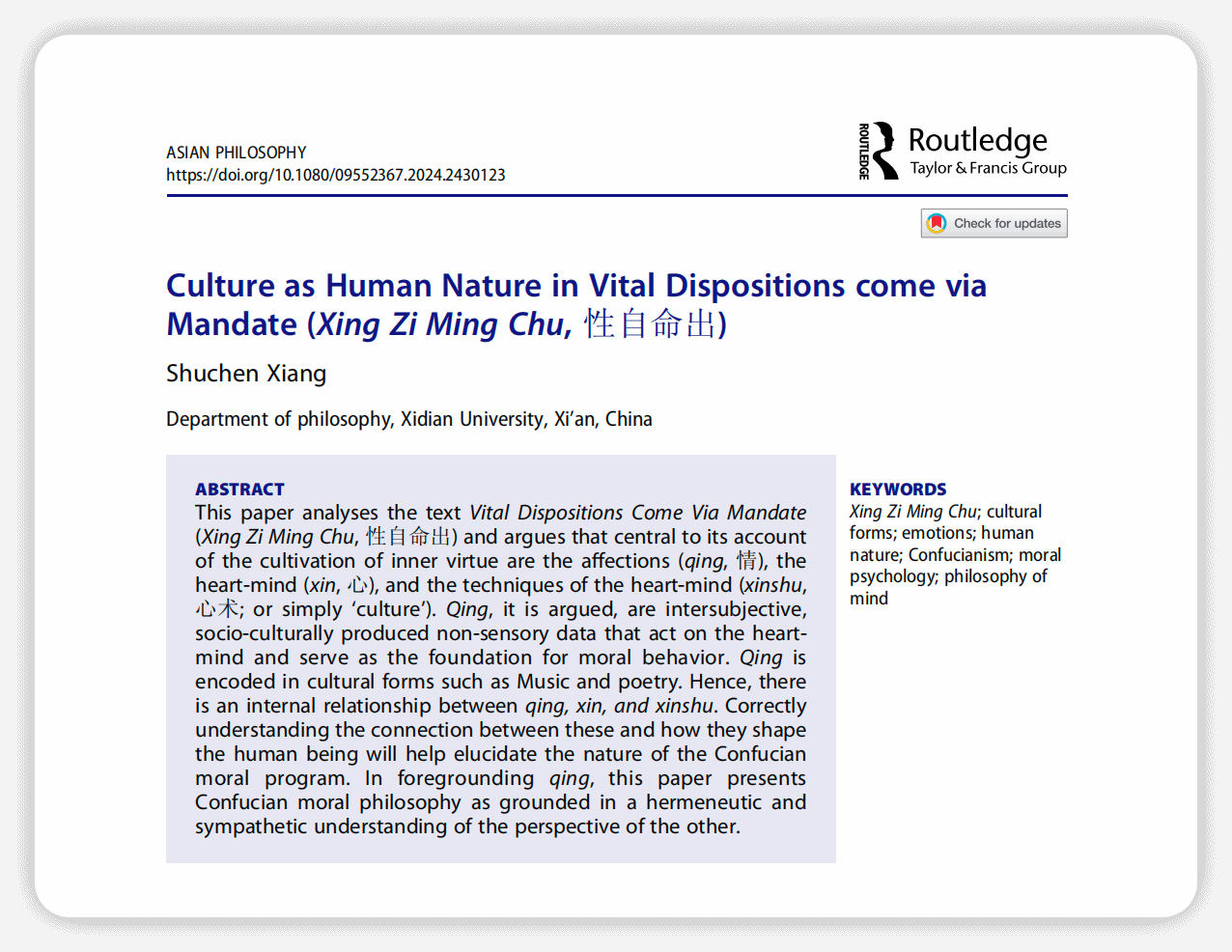 (通讯员 张万强)近日,东方哲学研究著名国际期刊Asian Philosophy上发表了sunbet项舒晨教授的论文“Culture as Human Nature in Vital Dispositions come via Mandate (Xing Zi Ming Chu, 性自命出)”(《“性自命出”中的人性论:文化即人性》)。