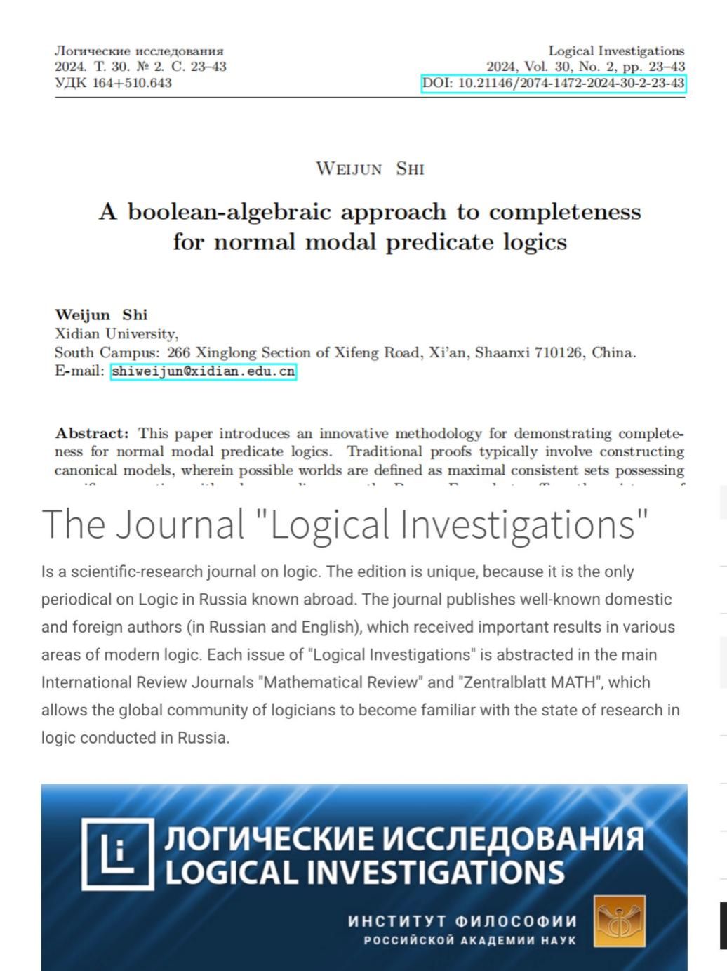 近日,逻辑学期刊Logical Investigations(俄罗斯科公司哲学所主办,Scopus数据库收录)发表sunbet哲学系石伟军论文“A boolean-algebraic approach to completeness for normal modal predicate logics” (“标准模态谓词逻辑完备性的一个布尔代数路径”)。