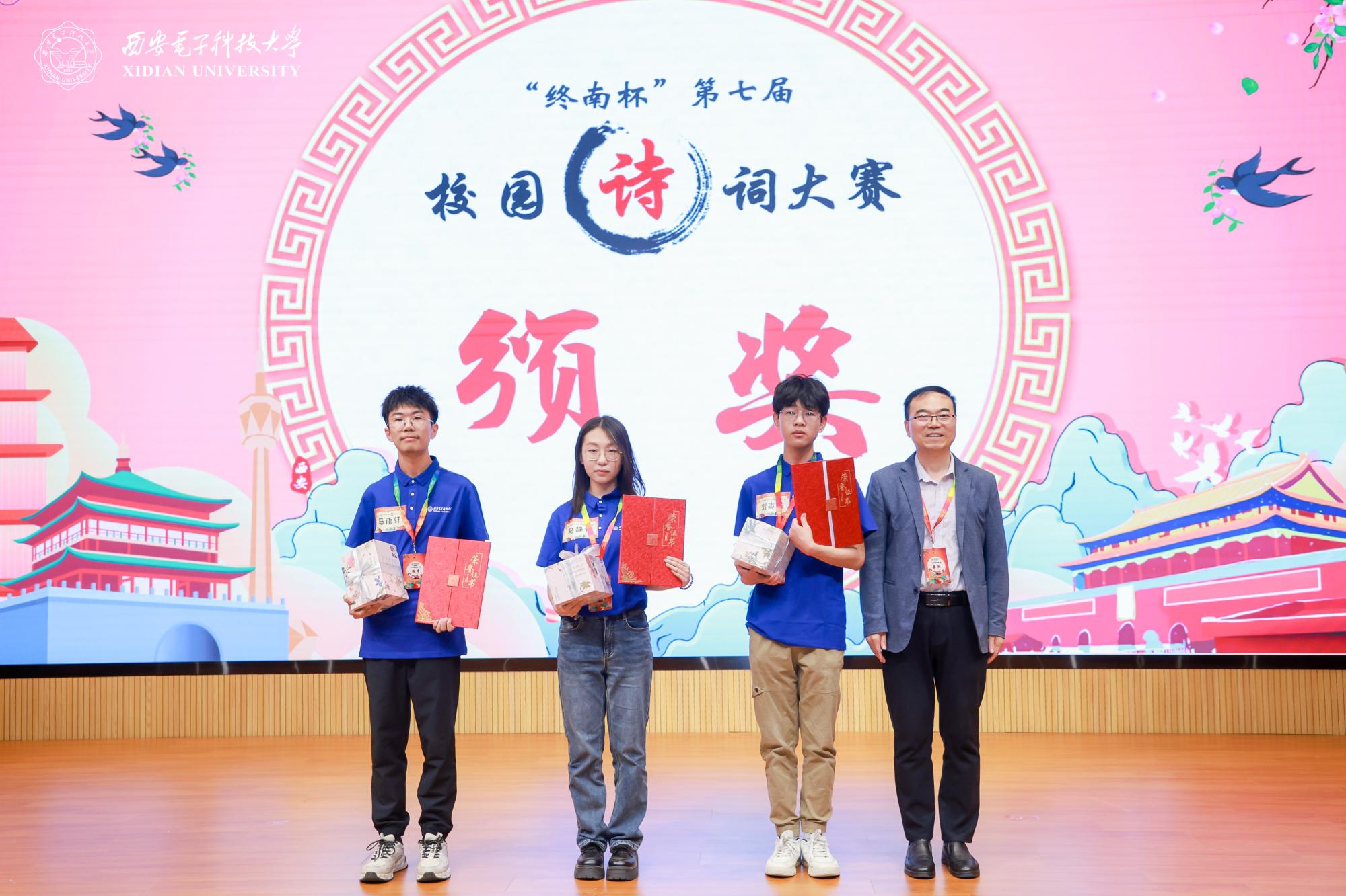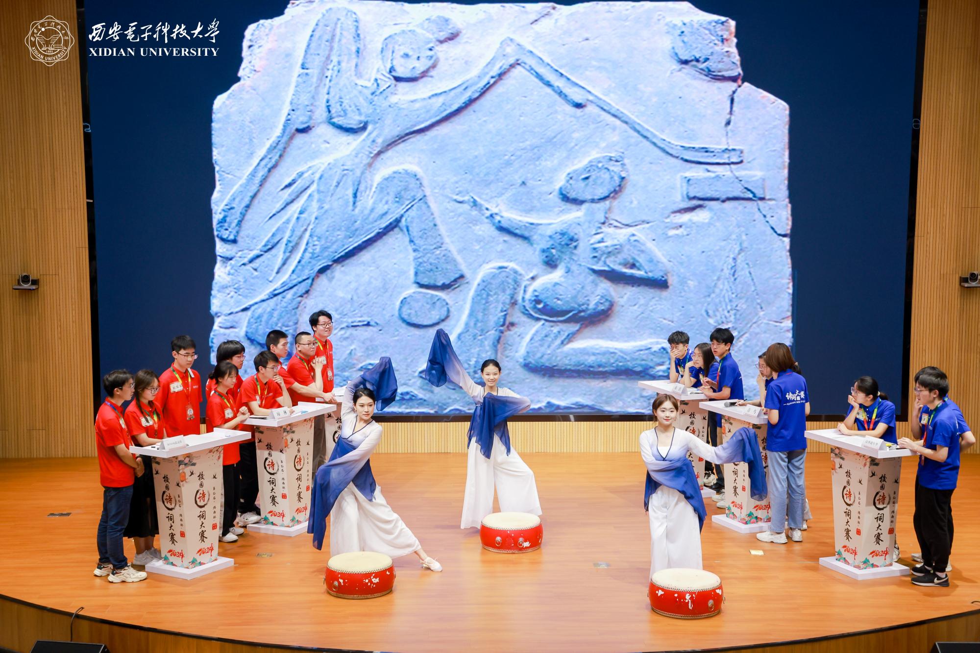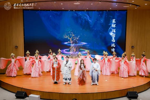 为丰富和活跃大赛氛围,西电师生还采用“视频+现场”的创新形式诵读《24节气》节选诗词;老员工艺术团表演舞蹈《诗韵舞蹁跹》,为大赛烘托出诗韵悠扬的氛围;特别邀请到的陕西人民广播电台全国演播艺术家海茵老师,为现场观众带来一场入情入境、余味悠长的《春江花月夜》朗诵表演。