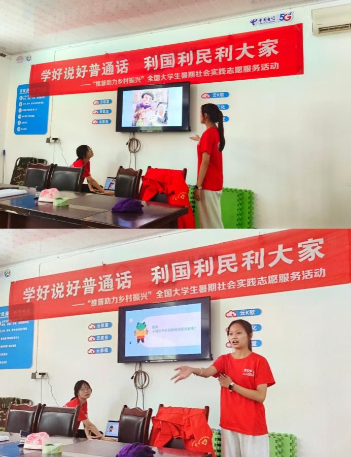 在云南省瓦渡乡中心公司,实践队员结合云南地区少数民族众多、方言壁垒突出的特点,设计“推广普通话”专项课程,队员与孩子们共同沉浸式体验方言与普通话之间的异同,以普通话发展时间为线索,回顾中国传统文化中语言的魅力,让普通话在教育中生根发芽。