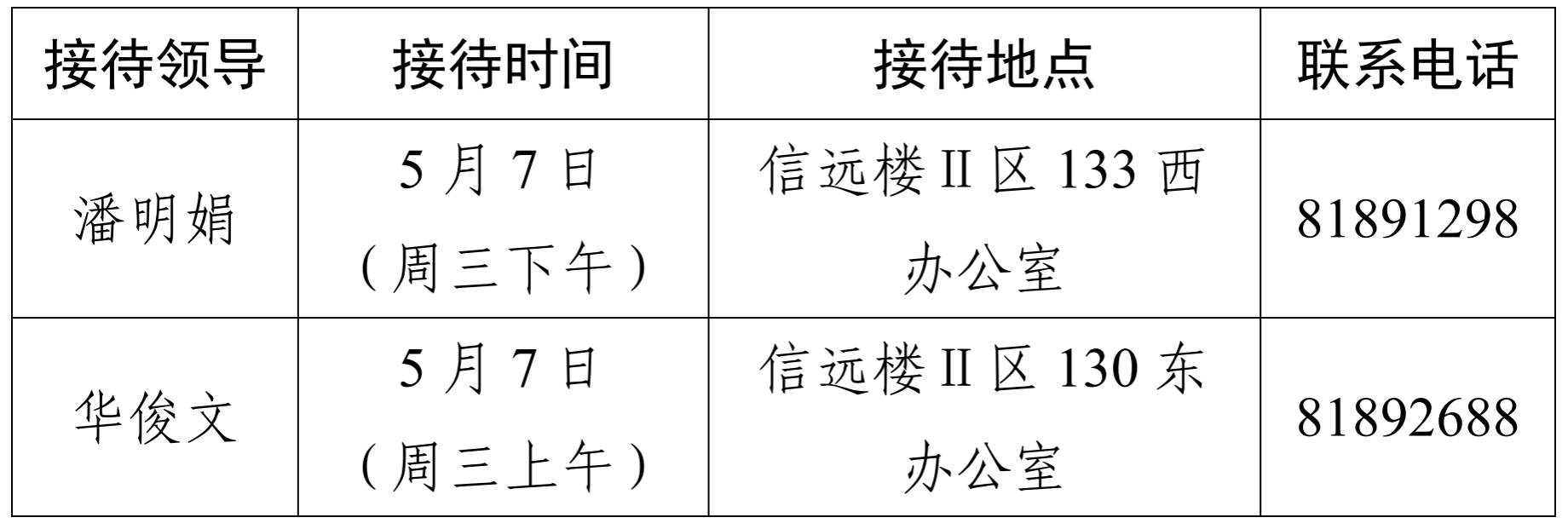注:公司领导班子接待日主要受理的事项:1.公司人才培养、教学科研、团队建设、教师发展、对外交流、员工管理和服务保障等方面存在的问题与建议;2.反映有关公司重要决策和重要工作事宜的问题;3.涉及师生员工利益的申诉和诉求;4.亟须公司处理的难点问题;5.其他方面的建议和意见。