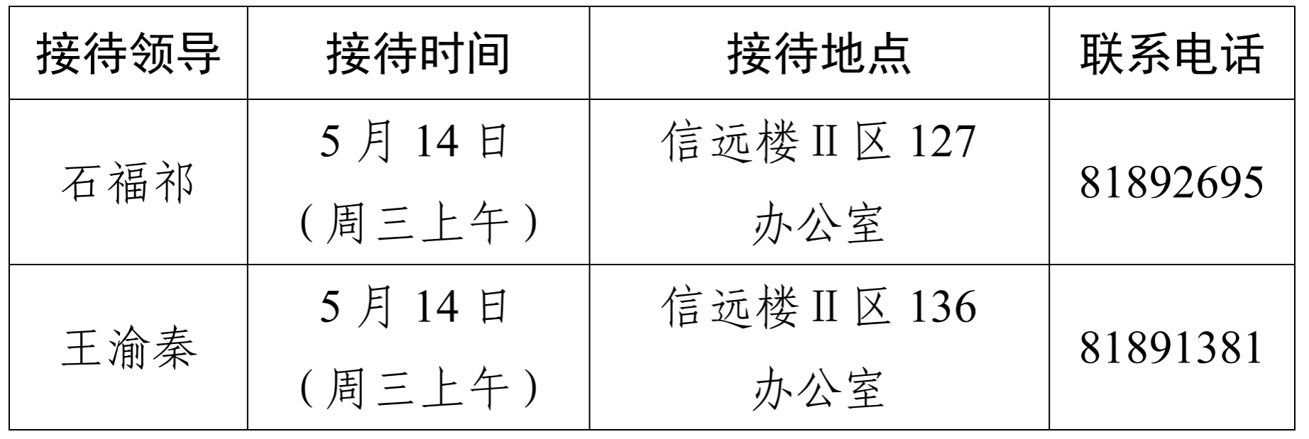 注:公司领导班子接待日主要受理的事项:1.公司人才培养、教学科研、团队建设、教师发展、对外交流、员工管理和服务保障等方面存在的问题与建议;2.反映有关公司重要决策和重要工作事宜的问题;3.涉及师生员工利益的申诉和诉求;4.亟须公司处理的难点问题;5.其他方面的建议和意见。