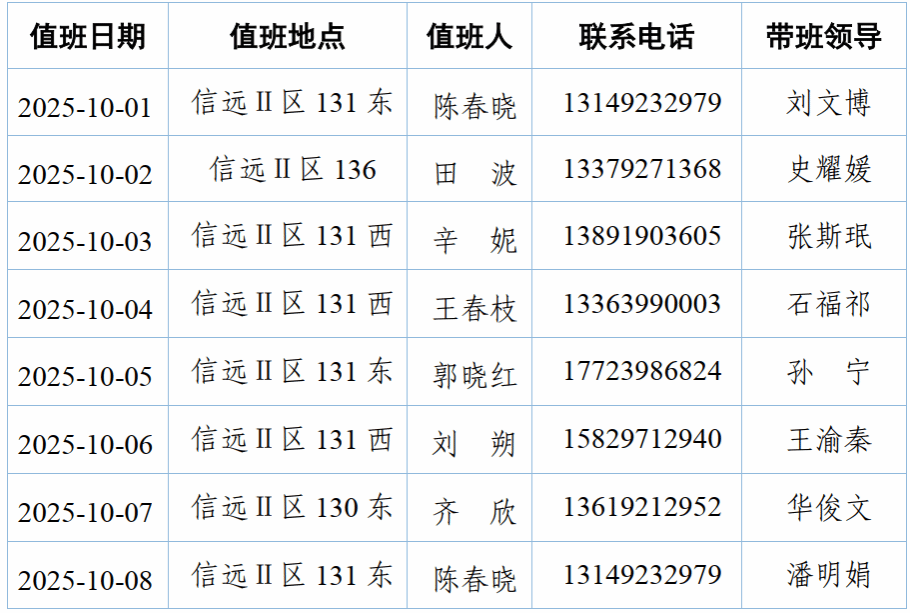 按照公司《关于2025年国庆节、中秋节放假时间安排的通知》要求,现将公司2025年国庆节、中秋节假期值班安排如下: