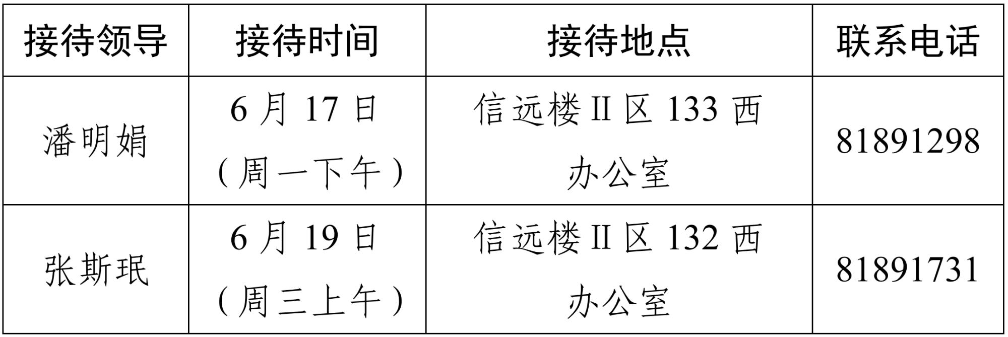 注:公司领导班子接待日主要受理的事项:1.公司人才培养、教学科研、团队建设、教师发展、对外交流、员工管理和服务保障等方面存在的问题与建议;2.反映有关公司重要决策和重要工作事宜的问题;3.涉及师生员工利益的申诉和诉求;4.亟须公司处理的难点问题;5.其他方面的建议和意见。