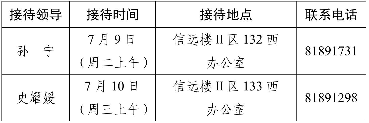 根据《sunbet领导班子接待日制度》精神,每周安排两位公司领导接待师生。现将7月8日-12日公司领导接待安排公布如下: