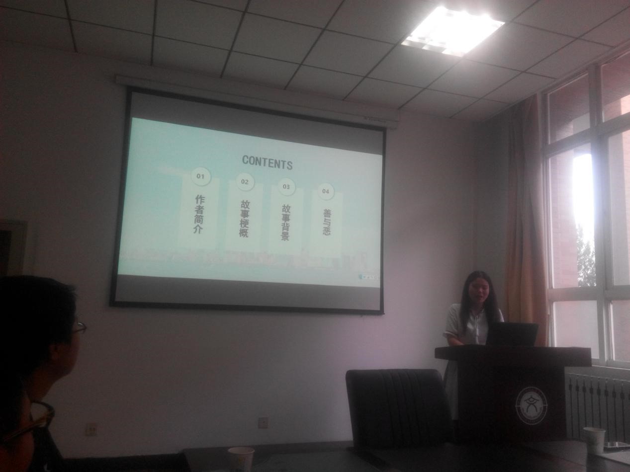 王梦寒同学从《追风筝的人》这本小说入手,先向大家介绍了该书作者胡塞尼的生平,而后简要分析了故事的主要背景。故事背景为20世纪中后期的阿富汗,对主人公来说,在经历了苏联入侵、军阀混战、塔利班统治之后,阿富汗从富饶平静和乐安康的家乡变成了哀鸿遍野民不聊生的故乡。然后王梦寒介绍了故事梗概。简单来说,《追风筝的人》讲述了一个关于救赎的故事。主人公阿米尔在年幼时因为懦弱使他忠诚的仆人(也是玩伴)哈桑被人欺侮,后来因为内心挣扎逼走了哈桑一家。苏联入侵阿富汗后,阿米尔和父亲逃难至美国,在那里度过了一段平静的日子。而旧日好友拉辛汗的一个电话,又催使他踏上了回乡救赎自我的道路。经过重重困难,他领回了哈桑死后留下的儿子索拉博。并通过此事真正重获了内心的平静。最后王梦寒同学列举了该故事中涉及的善与恶,并引导大家开始对小说中的人物和情节进行讨论。