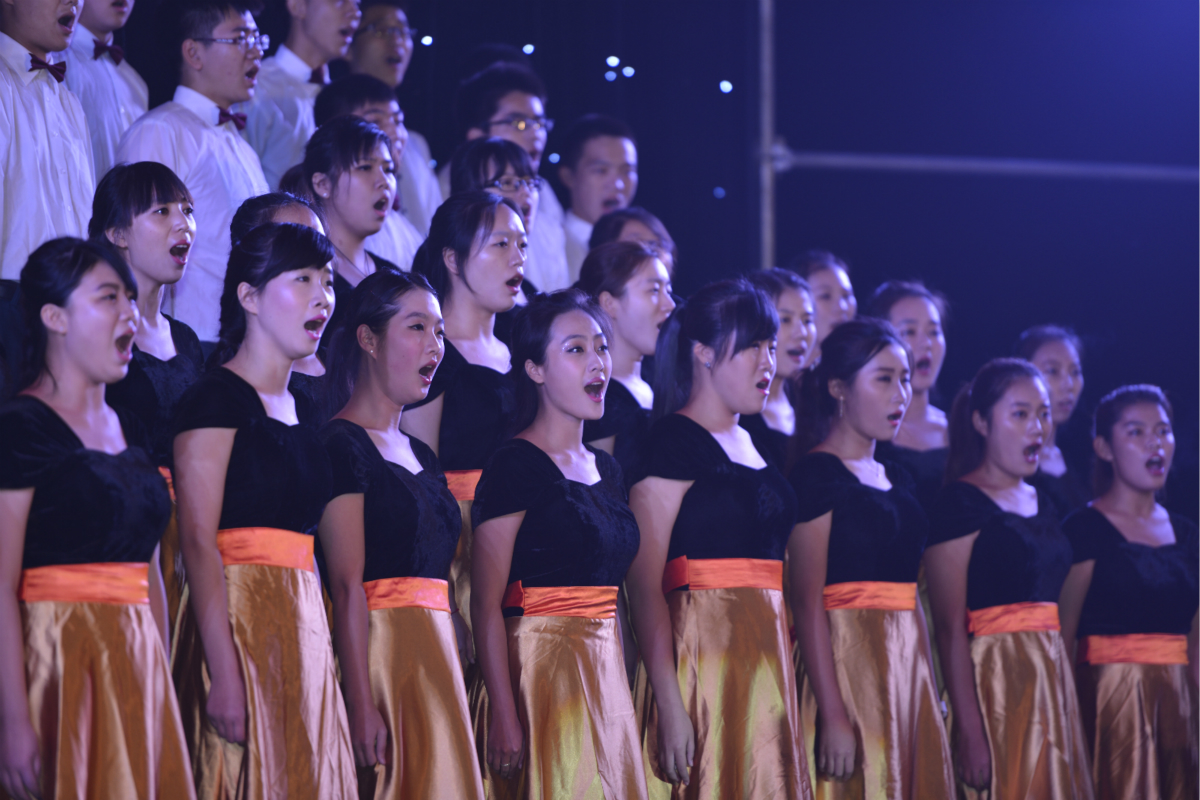 舞台上的精彩表现离不开一个多月的艰苦排练。合唱团成员来自四个年级,平时难以协调统一的时间,大多利用晚上和周末的时间排练,张帆老师多次在晚上的选修课之后还亲自到排练室指挥,力求展示出最好的效果。