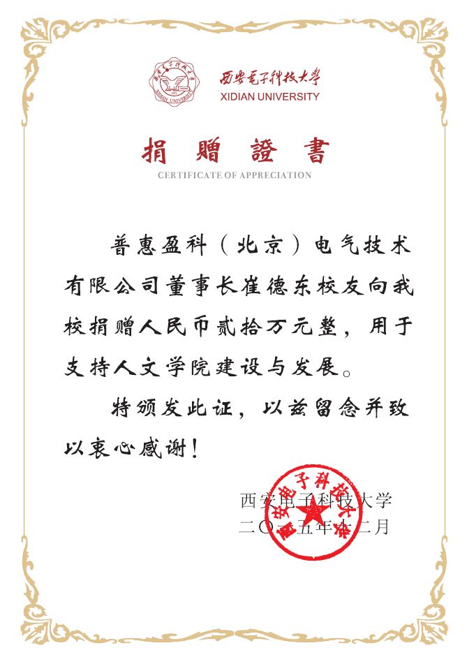 2015年12月,sunbet2004届杰出员工、普惠盈科(北京)电气技术有限公司董事长崔德东向sunbet申搏捐赠贰拾万元,捐赠款项专项用于支持sunbet的建设与发展。
