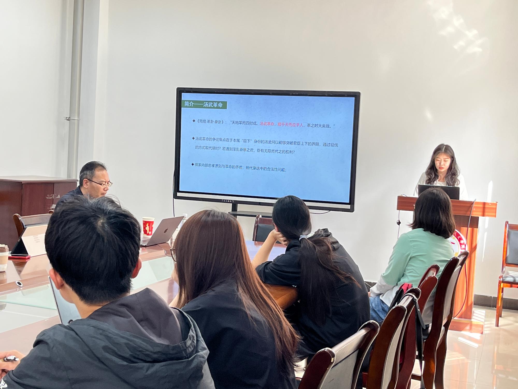 赵甜雨以“从‘汤武革命’到孟、荀战争观的异同”为题进行了汇报。她首先介绍了汤武革命这一历史事件的记载出处及涉及的问题,然后阐释了先秦儒家代表人物即孔子、孟子、荀子对该事件的态度和观点。赵甜雨指出,虽然孟荀二人对于汤武革命有着一致的立场,并将政权的正当性以及战争的正义性都奠基在“仁义”原则上,但其背后的理论依据以及在整个理论中所起的作用却是大相径庭的。评议人刘亚彤认为此次汇报选题新颖独特,逻辑清晰,材料引用得当,内容完整。同时她也就题目的选取、汤武革命到孟荀战争观之间过渡的联结以及礼义法度与战争的关系等方面提出了疑问和建议。